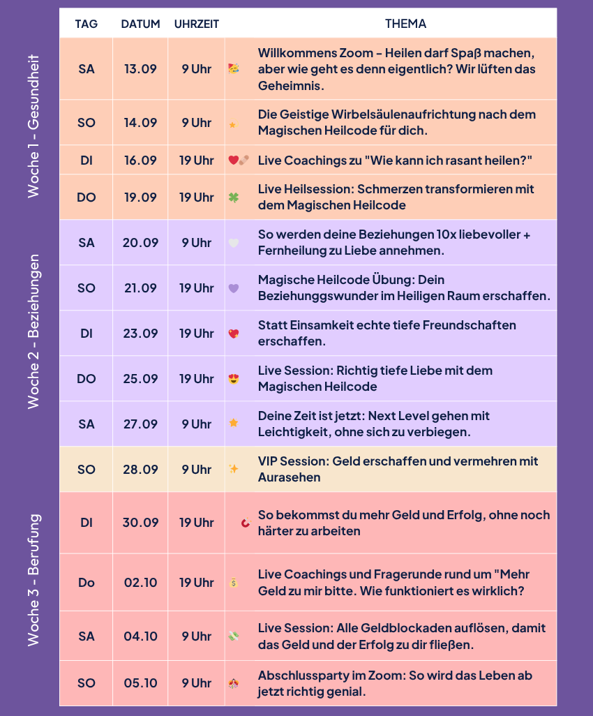 In 13 Online-Live-Sessions (inkl. Aufzeichnung) verändern wir deinen Blick auf Beziehung, Geld und Gesundheit und werden dein Leben komplett verändern.